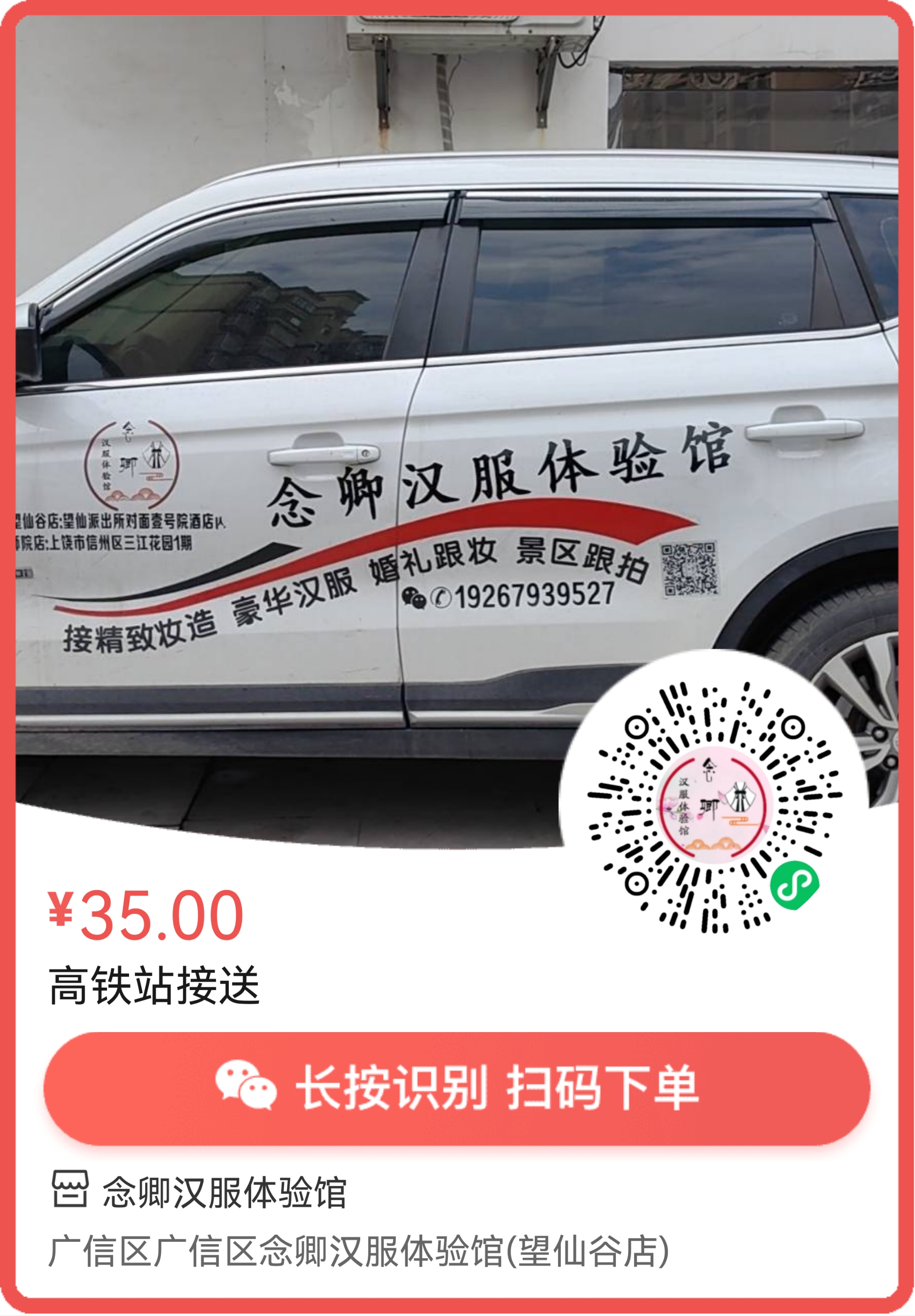 提供私家车接送服务,40元/人,来回双程75/人,包含高铁站接到葛仙店里,做好妆造再送到景区,晚上再景区接回店内,一站式省心服务!如第二天去其他景区可帮忙约车,店内车队价格合理,省心安心!如遇节假日,根据节假日堵车情况,会对应上涨价格,望理解。 高铁站到葛仙40/人。 高铁站到望仙35/人 葛仙到望仙谷90/人